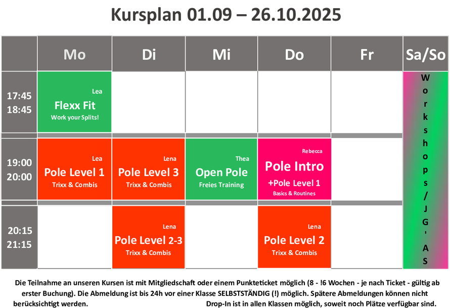 In 6 x 60 Minuten bekommst du einen Einblick in den Sport und in unsere Trainingsatmosphäre. Du machst deine ersten Schritte um die Stange herum und deine ersten Tricks an der Stange.